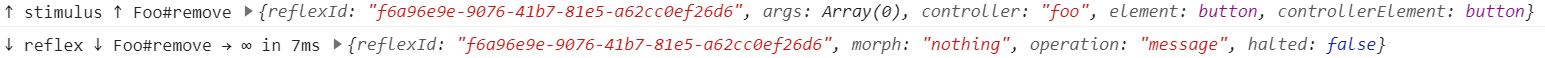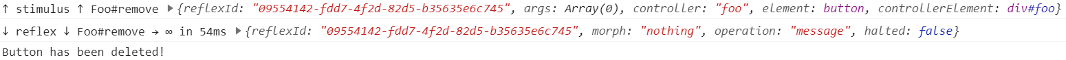 </div>These three attributes contain everything required to call the remove Reflex action on the Foo Reflex class when the user clicks the button. The button is now a Reflex Controller Element, because the StimulusReflex Controller responsible for the Reflex is attached to it. As a result, all life-cycle events will be emitted from it.
